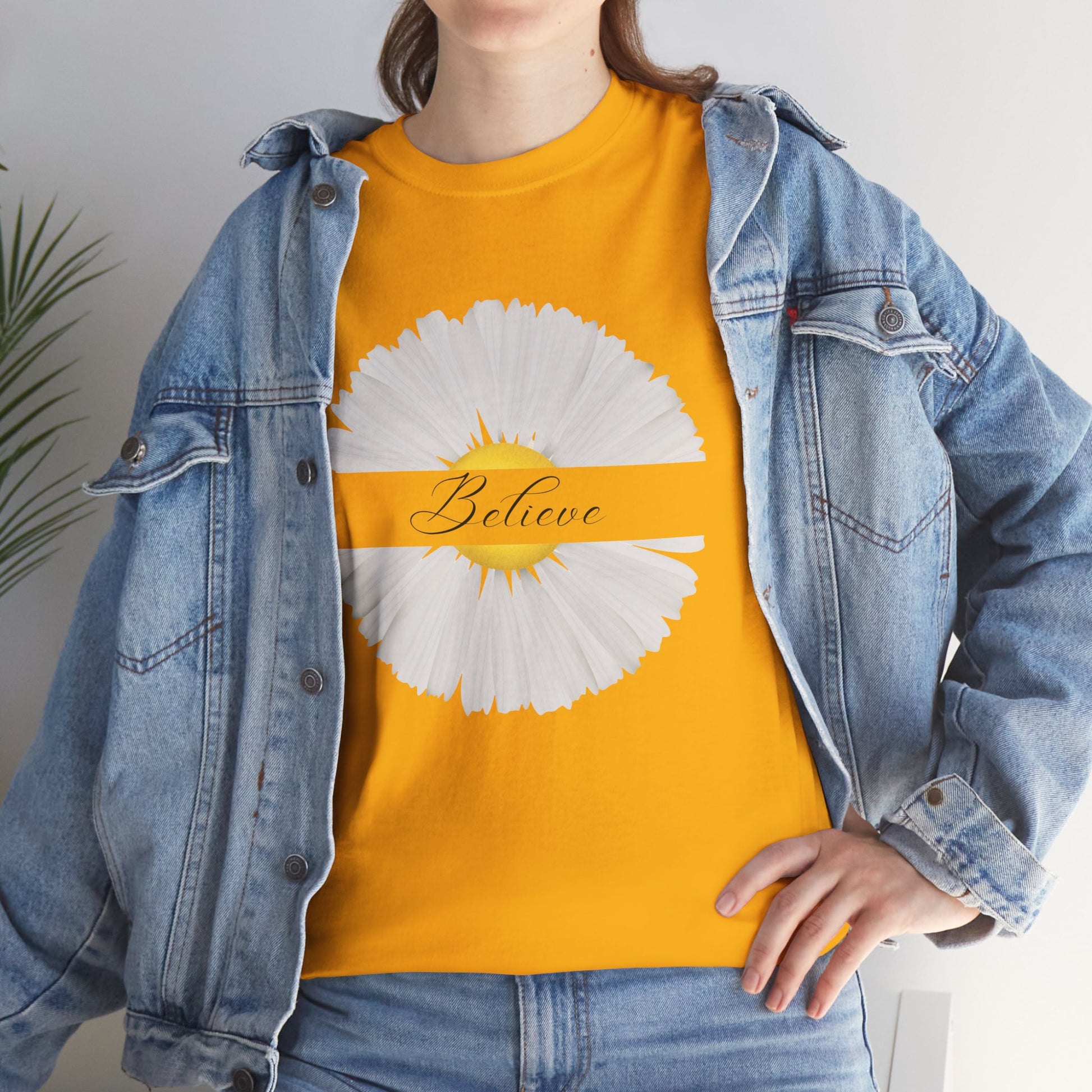A floral 'Believe' T-shirt designed for those who appreciate a touch of nature and positivity in their wardrobe. Perfect for casual wear or layering under a jacket. Suitable for adults looking for a stylish and comfortable tee.