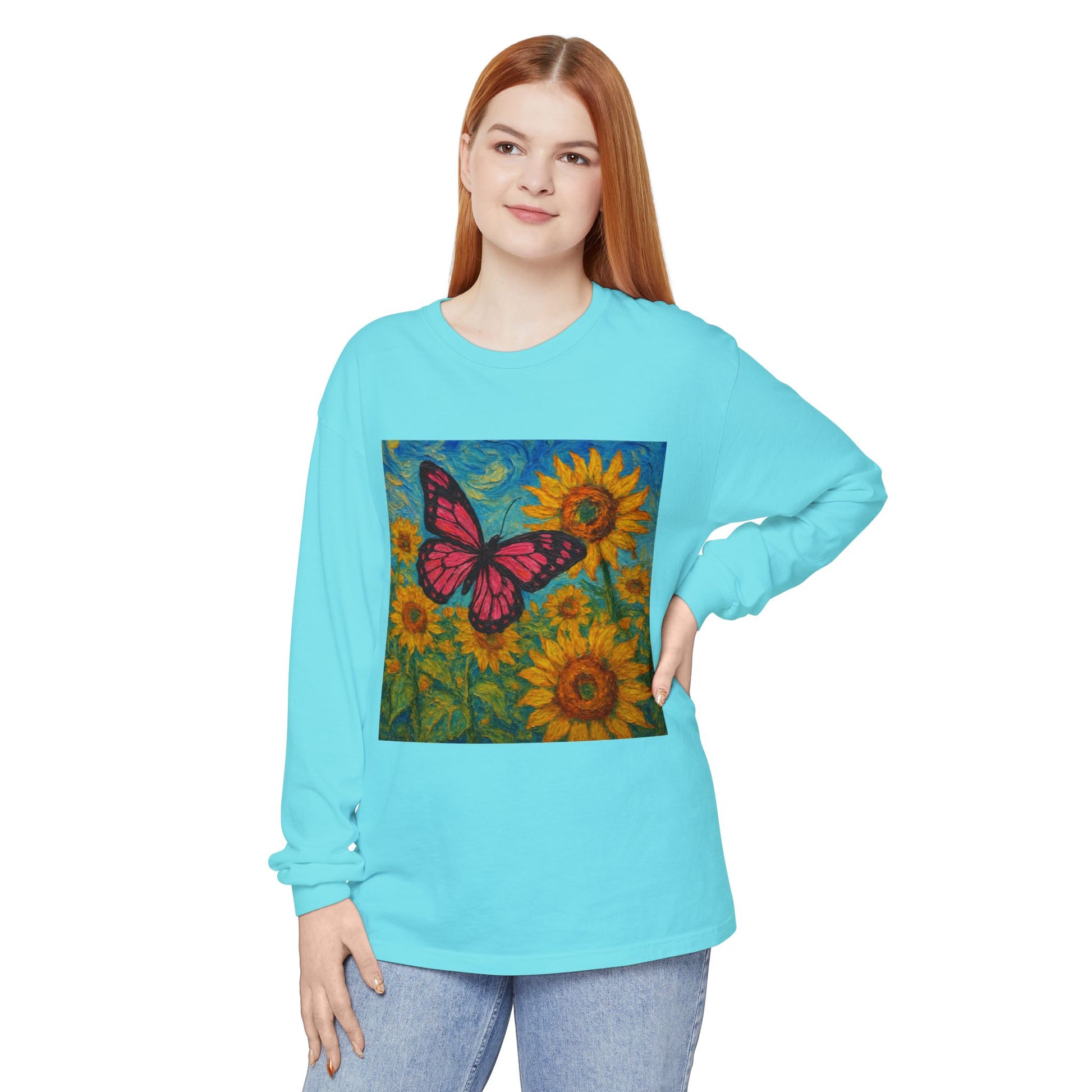 Wrap yourself in warmth and art with our Butterfly & Sunflower Sweatshirt – where nature meets creativity. This eye-catching design features a vibrant monarch butterfly fluttering above blooming sunflowers on a dreamy, painted blue sky. It’s more than a sweatshirt – it’s a wearable canvas of joy and self-expression. Made from soft, cozy fabric that feels as good as it looks, this sweatshirt is perfect for chilly days, comfy layering, or adding a pop of color to your everyday fit. Whether you're journaling in a café, exploring your creative side, or just vibing with nature, this piece radiates peace and power all at once.