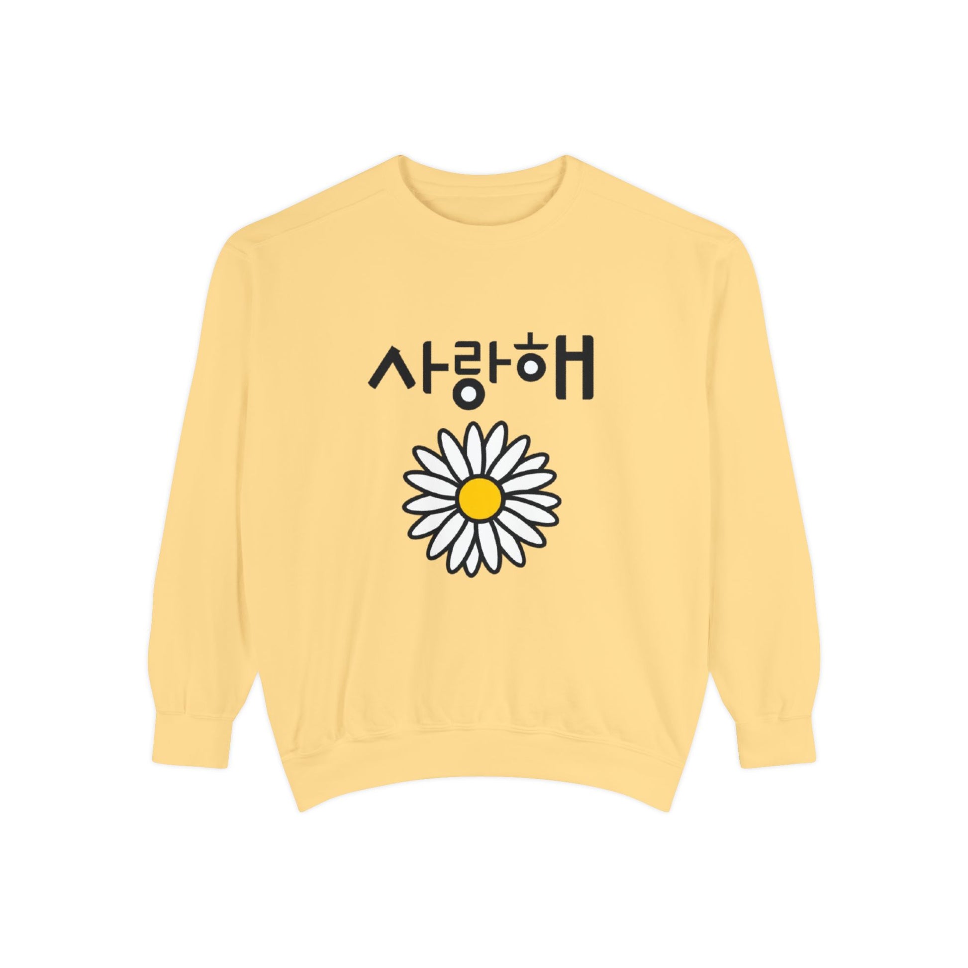 This Saranghae Daisy Sweatshirt exudes a cozy and casual vibe, perfect for everyday wear or lounging at home. It is relevant to those who appreciate Korean culture or daisies, making it a great gift for K-Pop fans or flower enthusiasts. Ideal for casual outings, relaxing at home, or attending K-Pop events.